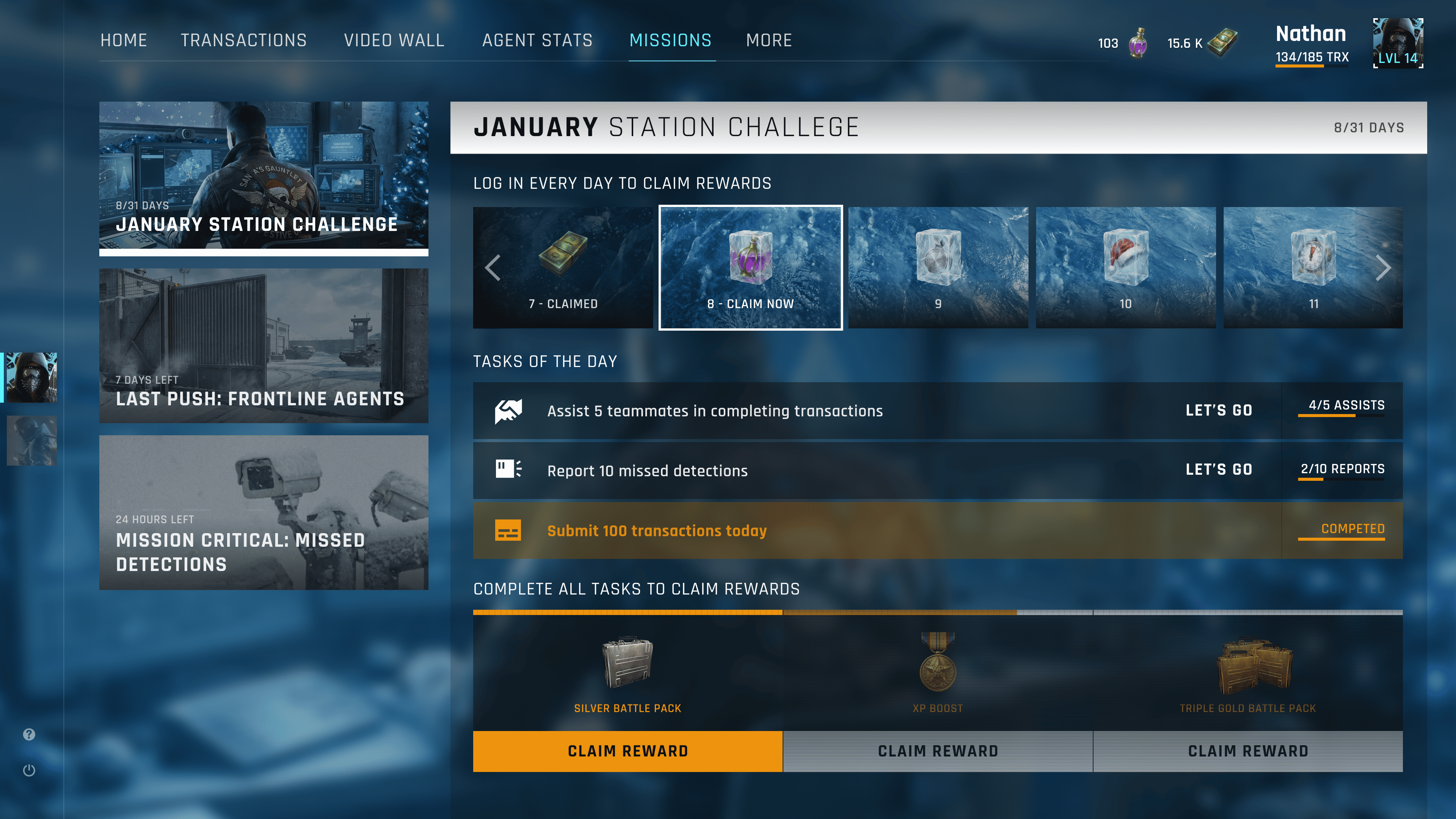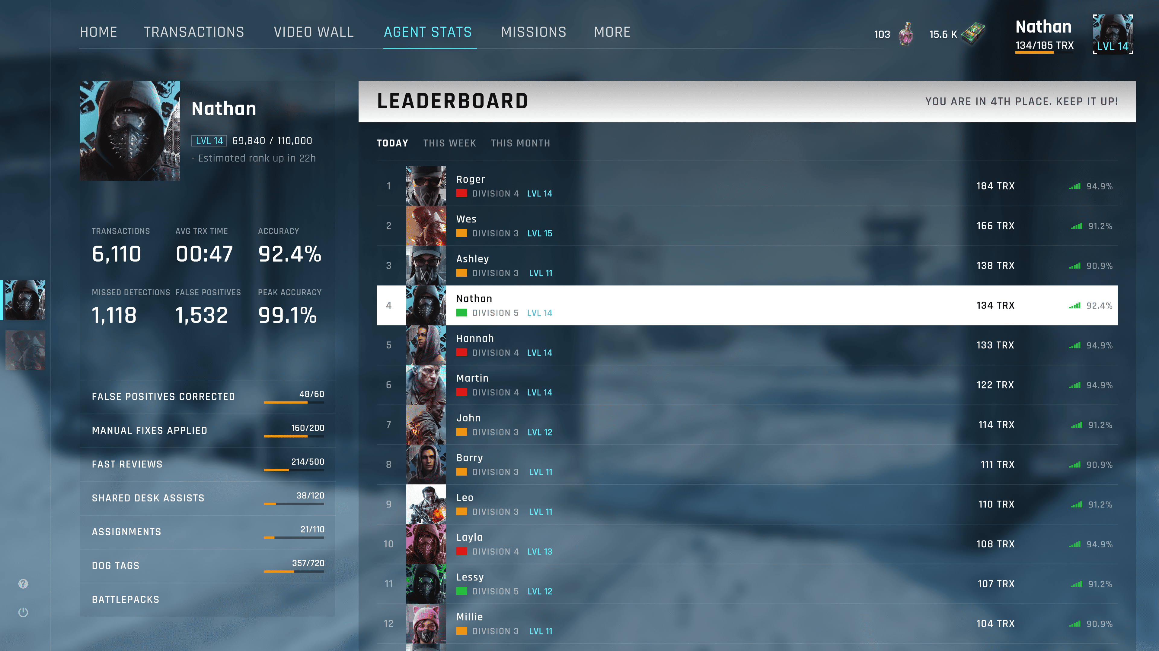 The interface blends a tactical, AAA game aesthetic with real operational data. Agents have a clear identity card showing level, progression, and personal performance, including total transactions, average handling time, and accuracy. Quality focused metrics such as missed detections, false positives, peak accuracy, and manual fixes reinforce precision over speed.