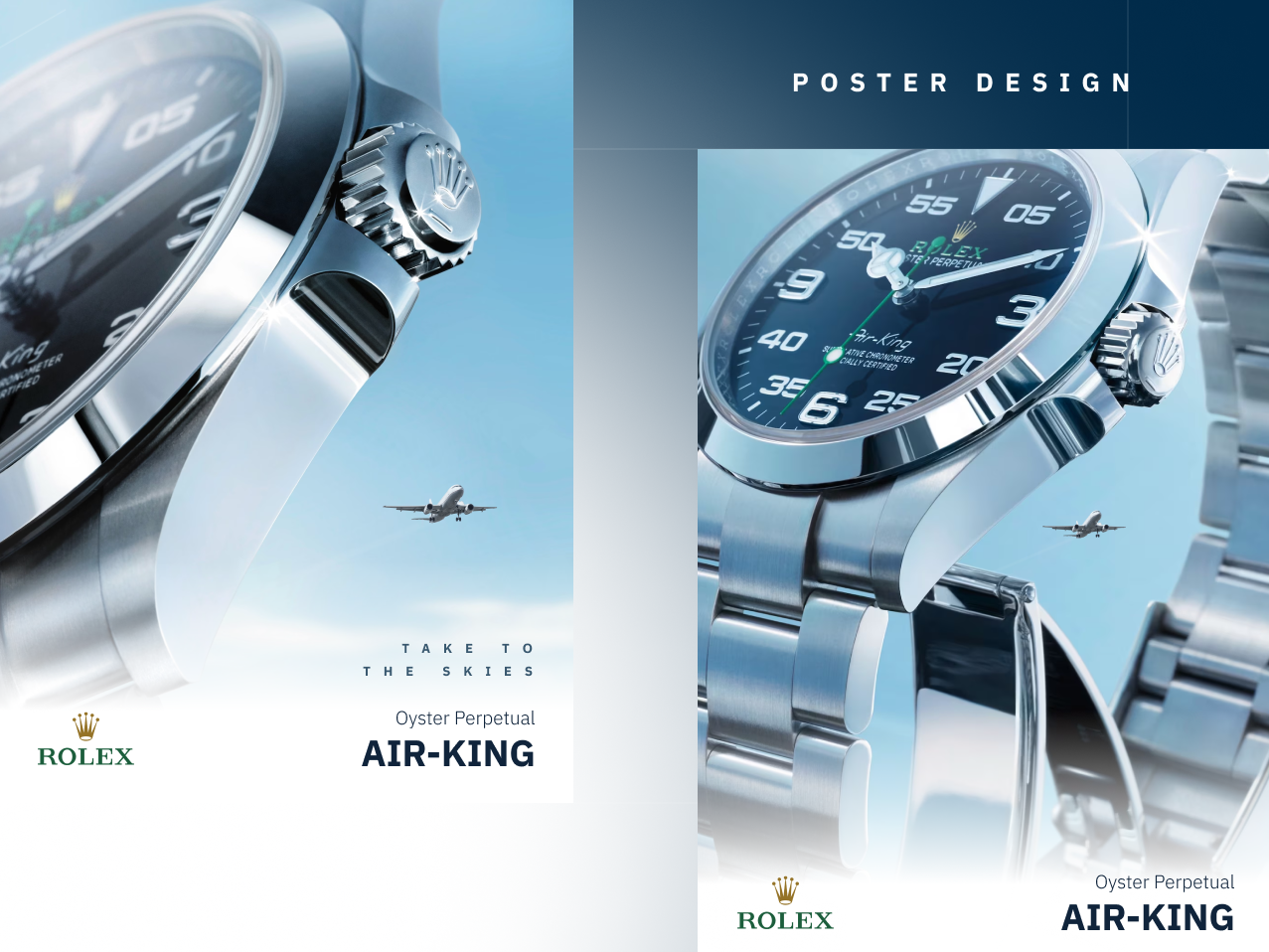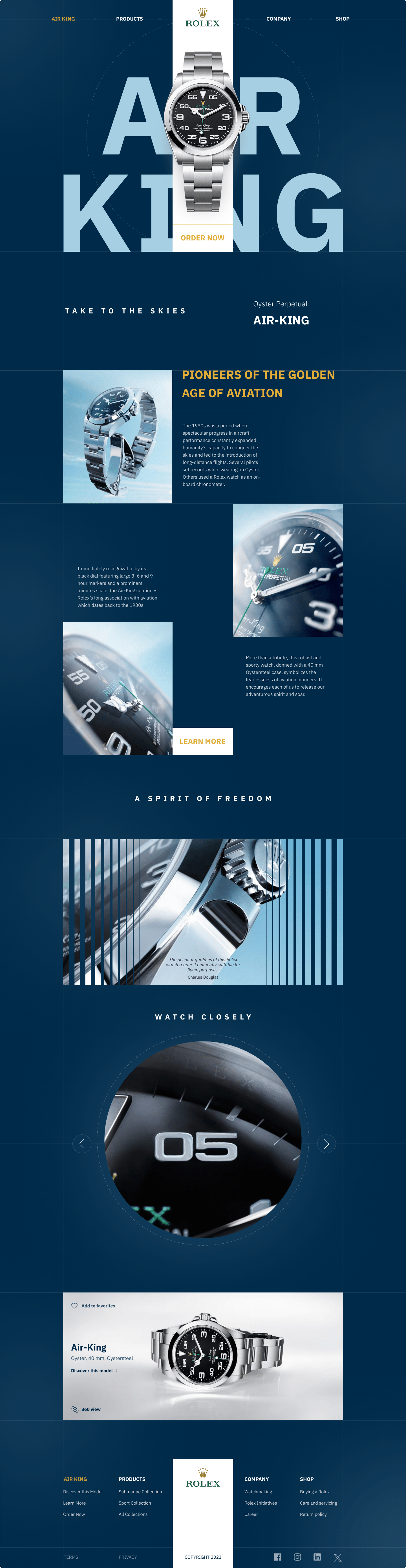 I crafted the landing page's look and feel, choosing fonts, colors, and images that embodied the Rolex brand and the Air-King's unique character. I also designed clear visuals to explain the watch's features and made navigating the page smooth and intuitive. It had to be as luxurious as the watch itself, but easy to understand for everyone.